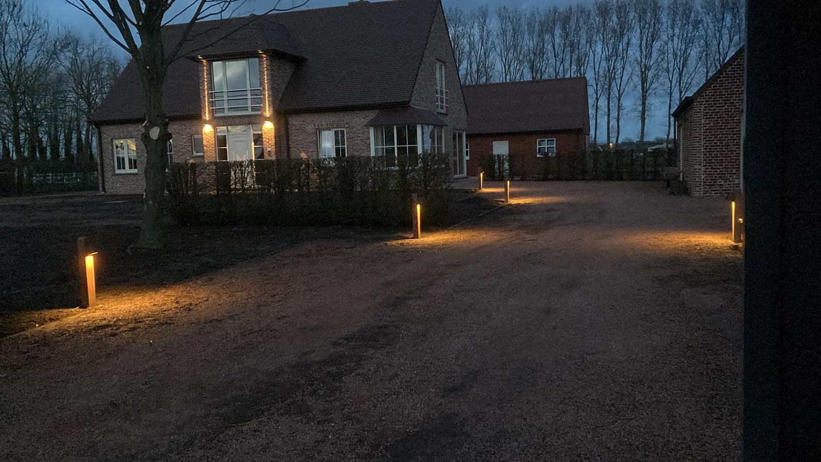 Het volledige domein is omheind en voorzien van een elektrische schuifpoort. Rechts vooraan de woning is er een grote garage met 2 parkeerplaatsen. Achteraan de woning bevindt zich nog een groot bijgebouw/tuinberging.