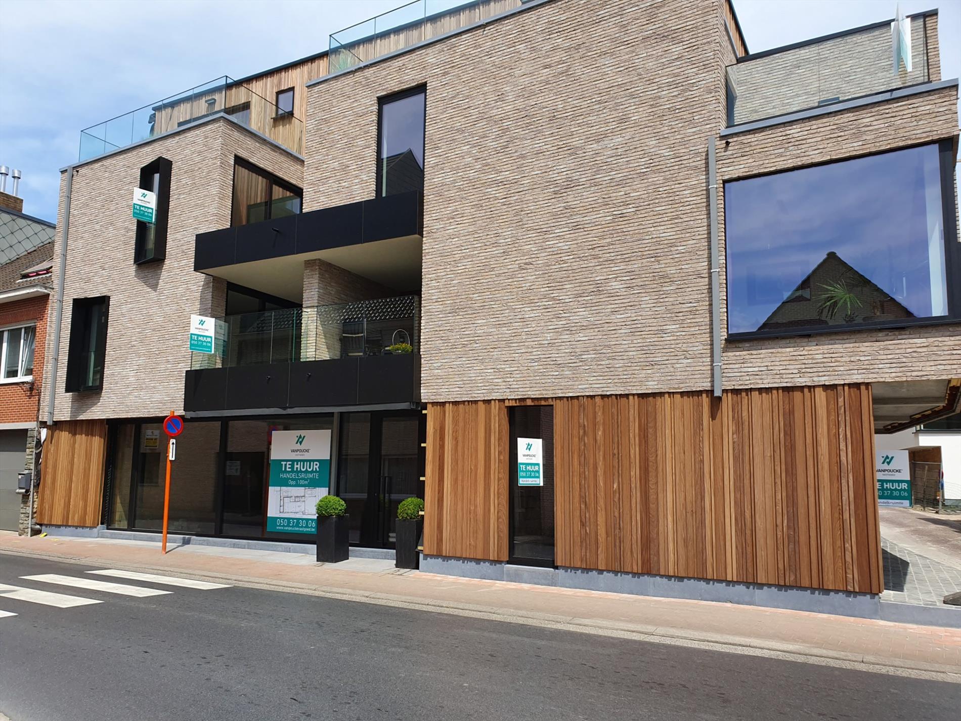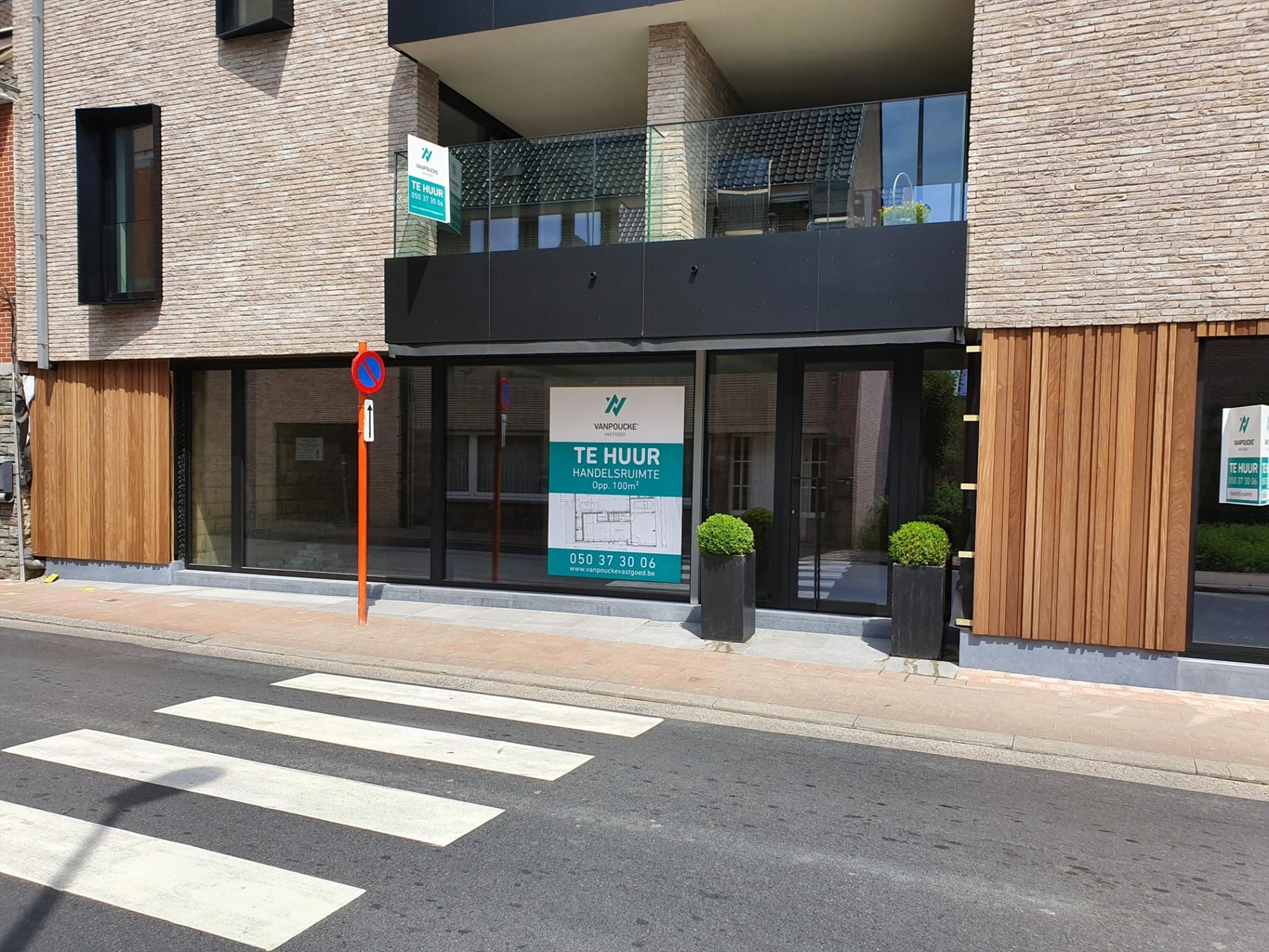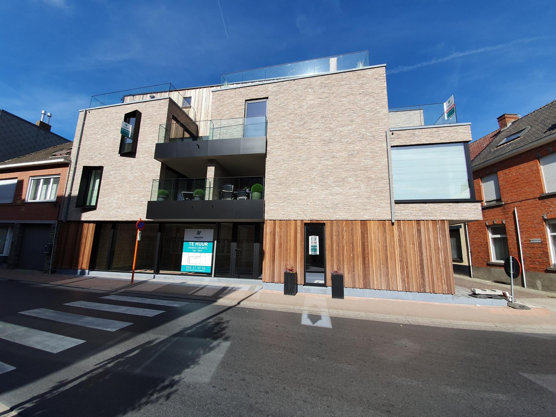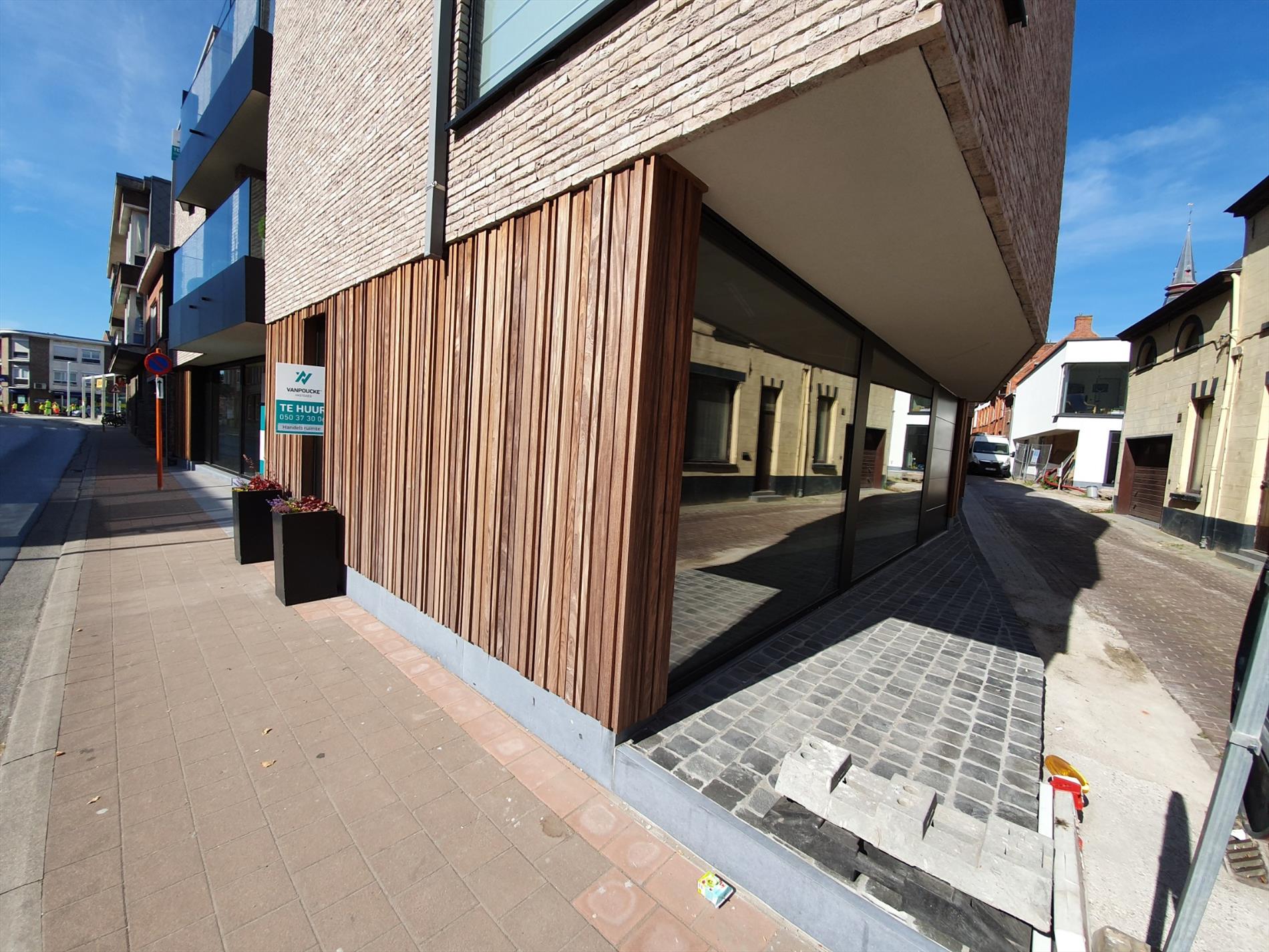 Deze handelsruimte bevindt zich op het gelijkvloers gedeelte van het appartementsgebouw, gelegen op het kruispunt tussen de Knesselarestraat en de Beernemstraat te Oedelem Centrum.