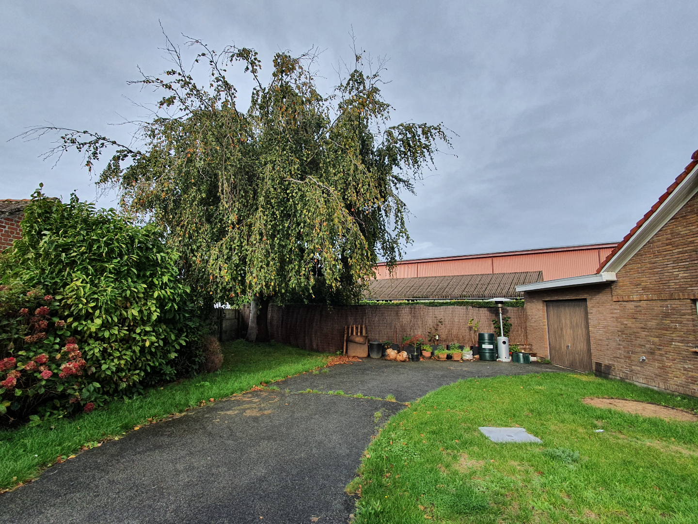 Naast de woning is er een grote oprit aanwezig met toegang tot de achterliggende garage. Het terras en verharde paden zijn aangelegd en omgeven van een grasperk.