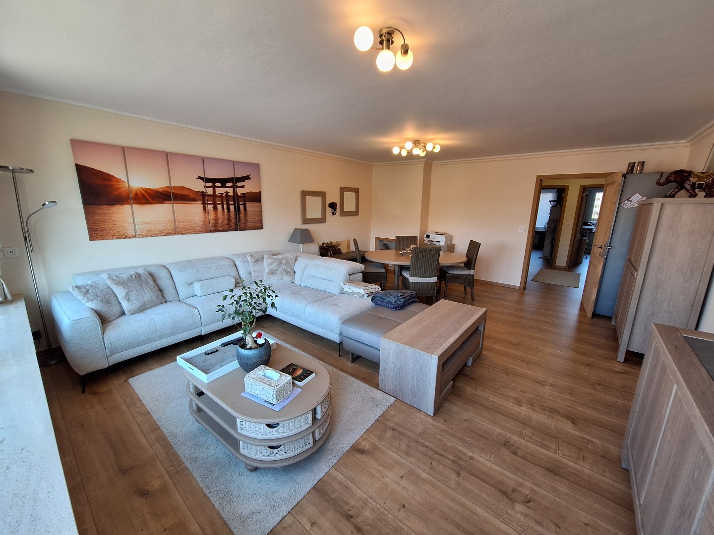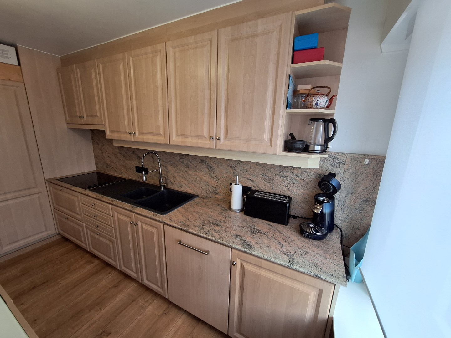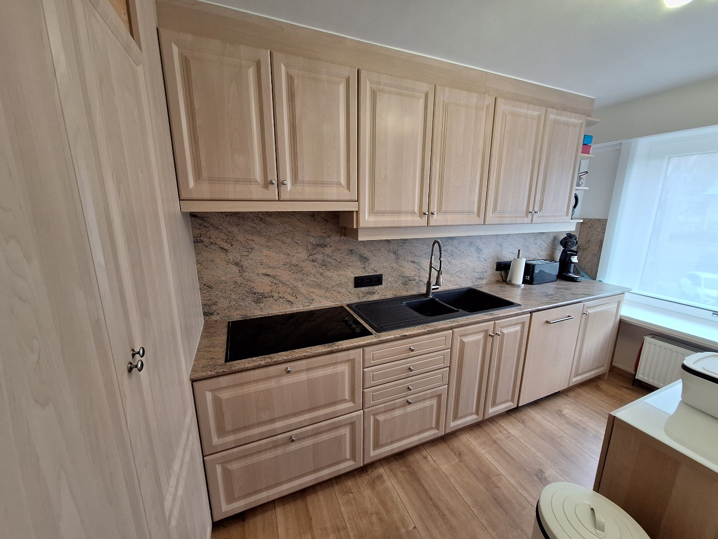 Aansluitend aan de grote, lichtrijke woonkamer bevindt zich de aparte keukenruimte met een ingerichte keuken en veel bergruimtes.