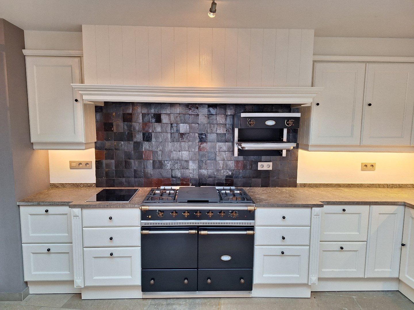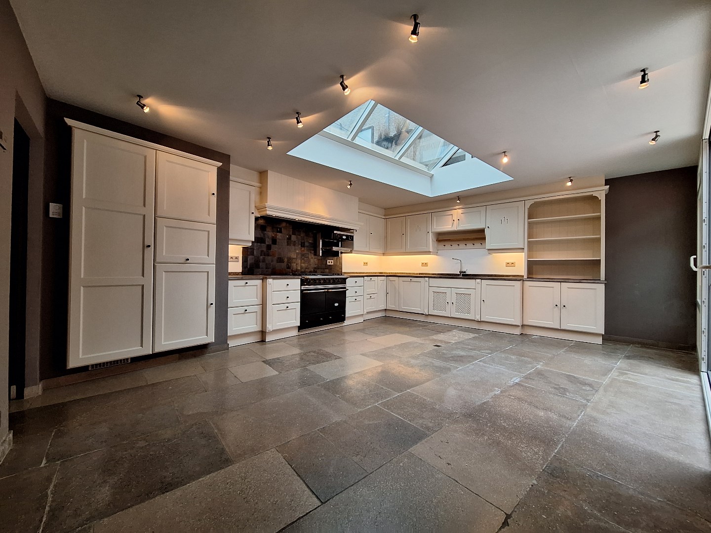 De ingerichte keuken heeft een professioneel 'Lacanche' gasfornuis (coup de feu bakplaat, 2 ovens, warmtelades, salamander), inductiekookplaat, natuurstenen keukenblad, dubbele spoelbak, vaatwasmachine, ingewerkte koelkast en veel keukenkasten. De natuurstenen tegelvloer geeft deze ruimte een extra warm karakter.