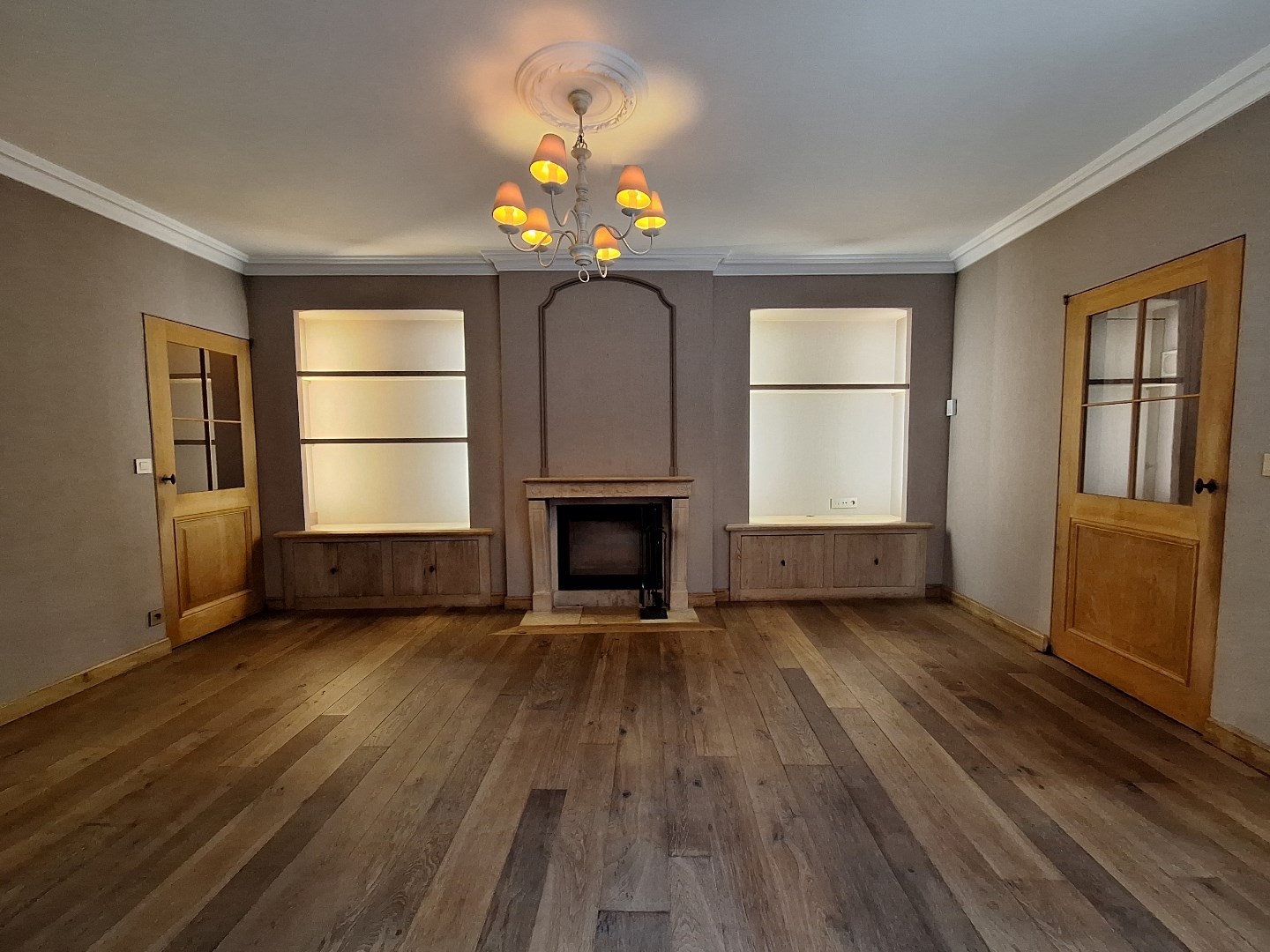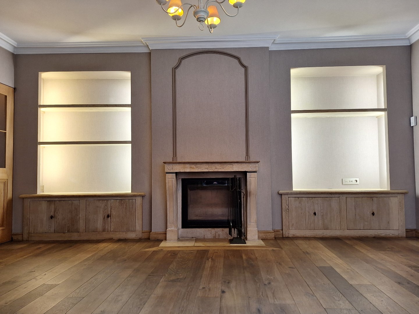 Zo beschikt de woonkamer over een massieve parketvloer en afgewerkte wandmeubel met ingebouwde haard.
