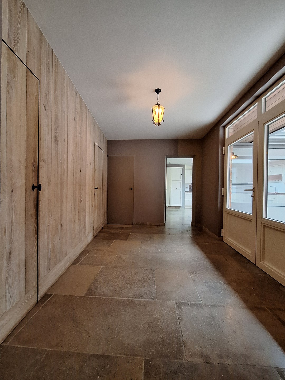 De vestiaire, berging en toilet zijn afgewerkt met een houten wandbekleding. De wasplaats bevat ingemaakte kasten op maat.